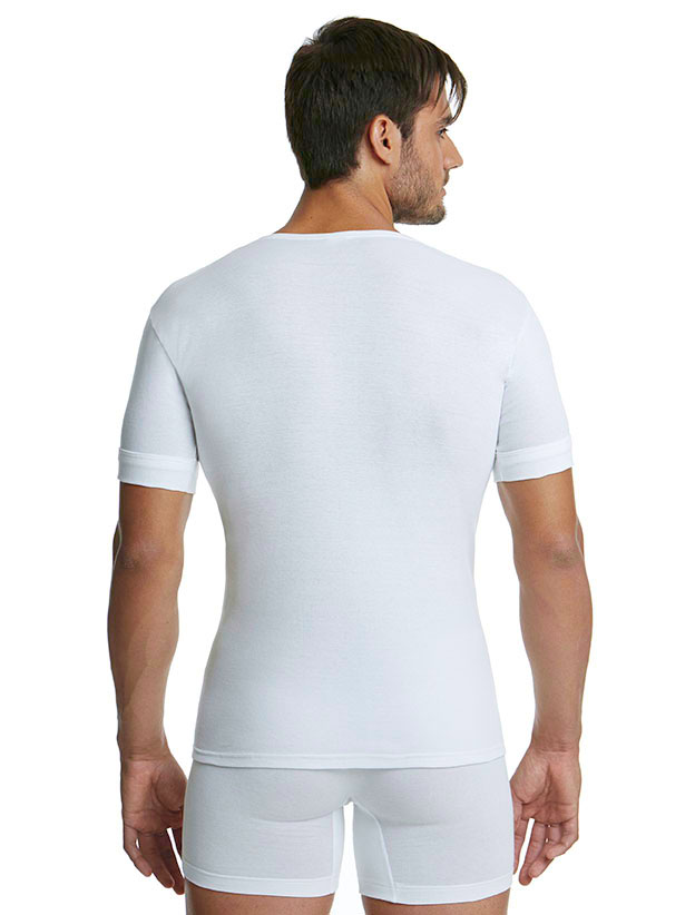 Ανδρική φανέλα κοντό μανίκι με ανοιχτή λαιμόκοψη και ρεβέρ στα μανίκια.