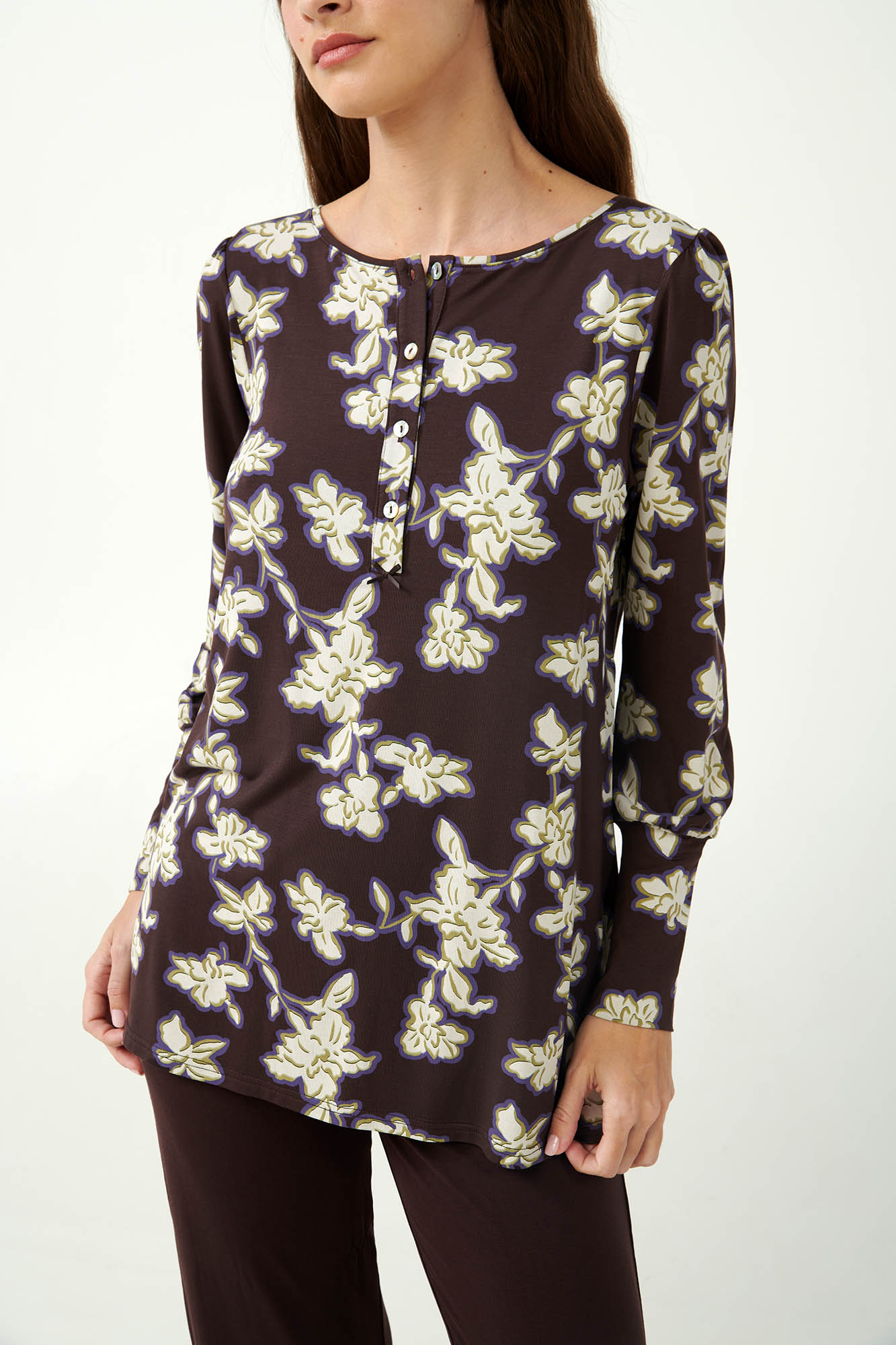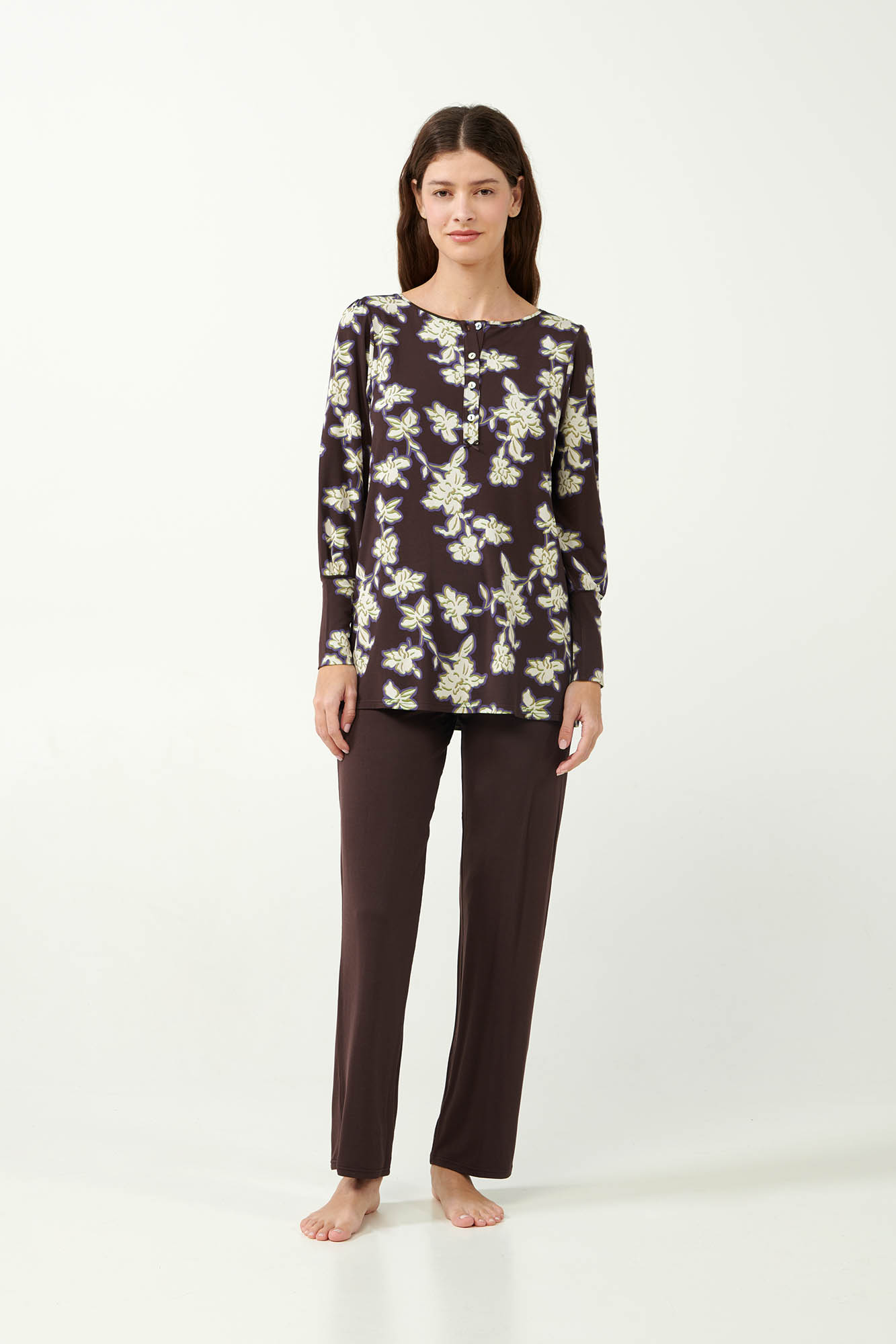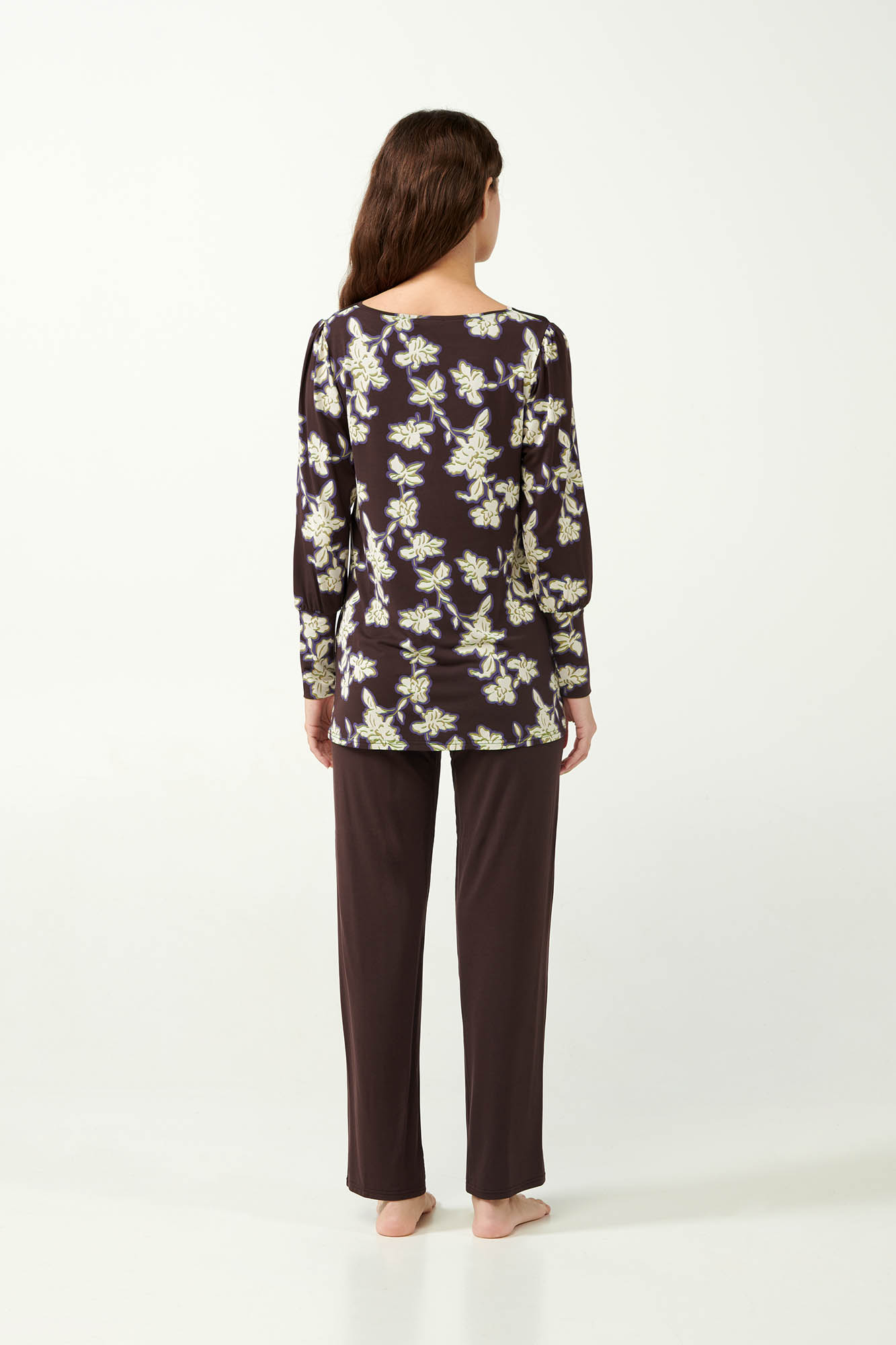 Απολαύστε έναν ιδανικό συνδυασμό στυλ και άνεσης με ένα σετ γυναικείες πιτζάμες. Φλοράλ μπλούζα με πατιλέτα και ιδιαίτερες μανσέτες που προσδίδουν κομψότητα και καλύτερη εφαρμογή. Το σετ συμπληρώνει ένα μονόχρωμο παντελόνι με φαρδύ λάστιχο στη μέση για βέλτιστη άνεση. Φτιαγμένες από απαλό micromodal με πολυτελές άγγιγμα αυτές οι πυτζάμες θα συνοδεύσουν ευχάριστα τις στιγμές χαλάρωσης ή το βραδινό σας ύπνο.