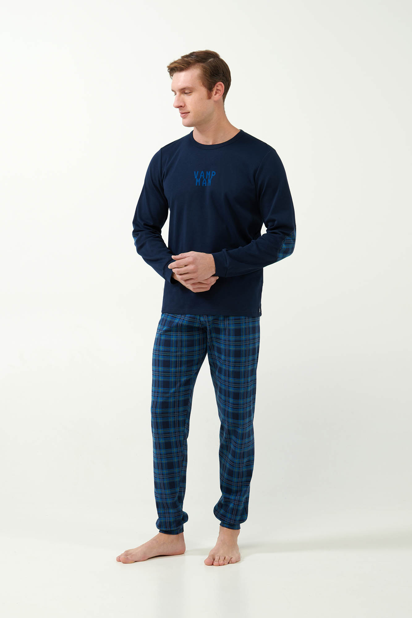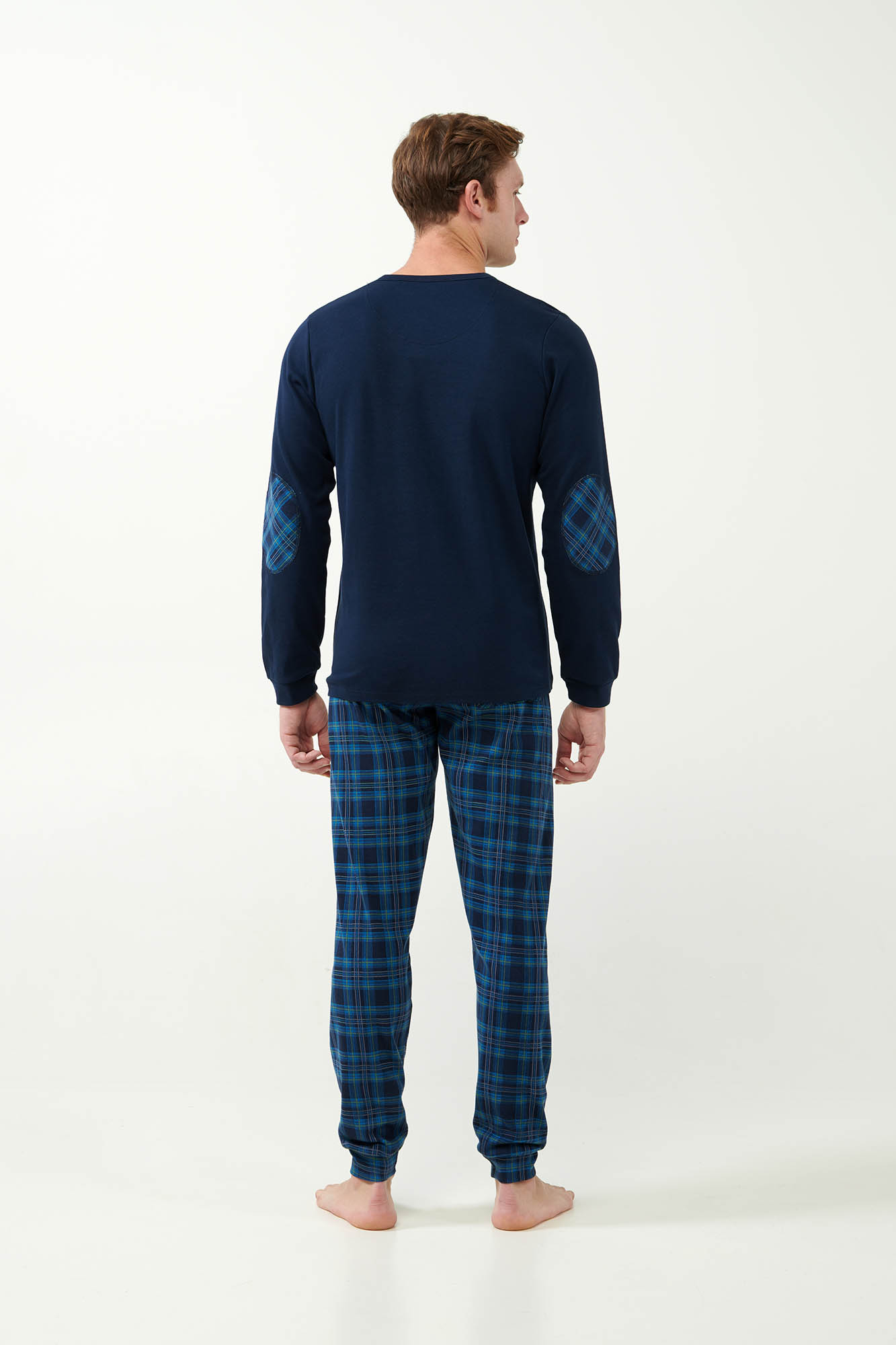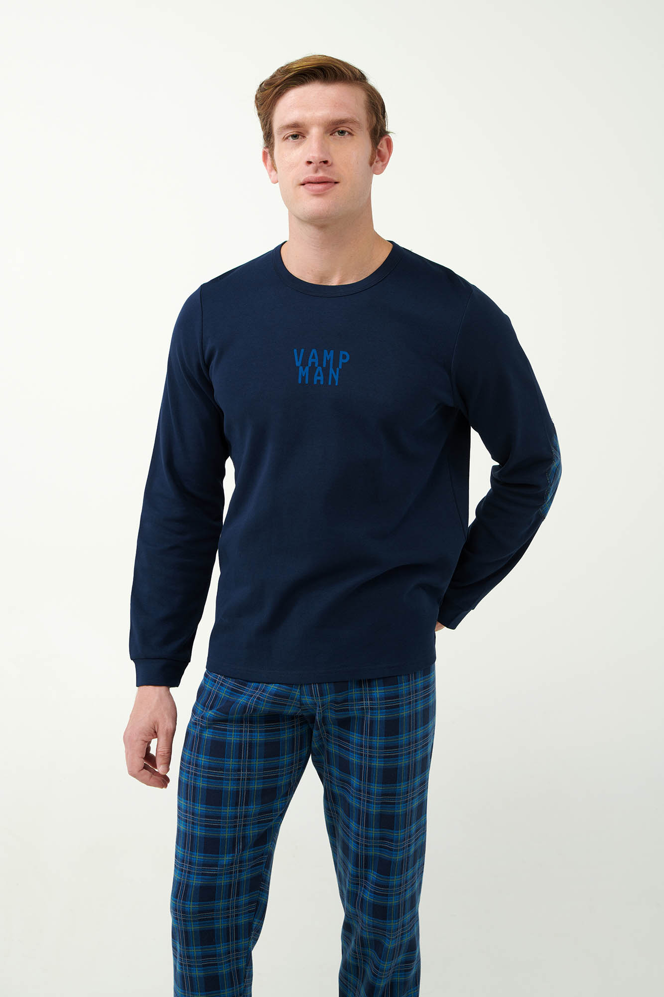 Ανανεώστε τη συλλογή σας με ένα σετ ανδρικές πιτζάμες κατασκευασμένο από 100% βαμβάκι Interlock που επιτρέπει στο σώμα να αναπνέει και χαρίζει ζεστή και απαλή αίσθηση στο δέρμα. Το σετ αποτελείται από μονόχρωμη μπλούζα με μανσέτες και διακριτικό τύπωμα στο στήθος. Συνοδεύεται από παντελόνι με μανσέτες σε μπλε ταρτάν μοτίβο. Μια όμορφη πρόταση που θα σας βοηθήσει να απολαύσετε τον βραδινό σας ύπνο.